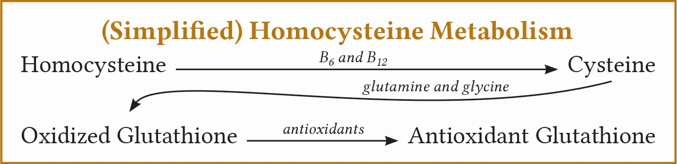 Homocysteine comes from protein metabolism. The more protein (especially animal protein) the body must metabolize, the more homocysteine production increases. Homocysteine is a toxic, prooxidant amino acid the body normally seeks to eliminate. It can simply be broken down and removed using vitamin B9 (folic acid), or it can be recycled into cysteine (by adding a methyl function from vitamins B6 and B12), and then into oxidized glutathione (with the addition of glutamine and glycine). For this oxidized glutathione antioxidant to find its main driving force for the body, it must then be reduced by using antioxidants.
