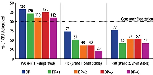 At DP+6—i.e. 6 months after the purchase date, or one year prior to the expiration date—the percentage of viable CFU probiotics for the refrigerated P20 was 112%—more than promised on the product label. The two “shelf-stable” probiotics fell well below what was promised on the label: P15 contained only 3 billion, or 20%, of the 15 billion promised on the label: P30 contained 13 billion, or 43% of the 30 promised.