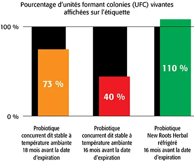 Recently, New Roots Herbal commissioned an ISO 17025–accredited analytical laboratory to perform a stability comparison between a refrigerated product from its probiotics line and a competing nonrefrigerated product. Both products had identical expiration dates, and a remaining conservation duration of 18 months. Knowing that Health Canada labeling allows 24 months for preservation duration on probiotics, six months had therefore elapsed since their manufacture. On the first day of the test, the unrefrigerated competitor’s probiotic already contained only 73% of the amount of colony-forming units (CFUs) claimed on the label; after 60 days (i.e. 16 months before its expiration date) at room temperature between 19 °C and 25 °C, the amount had fallen to only 40% of alleged CFUs. In comparison, after 60 days of storage in a refrigerator at a temperature between 2 °C and 8 °C, New Roots Herbal’s product still contained 110% of the declared number of UFC on the label.[11]