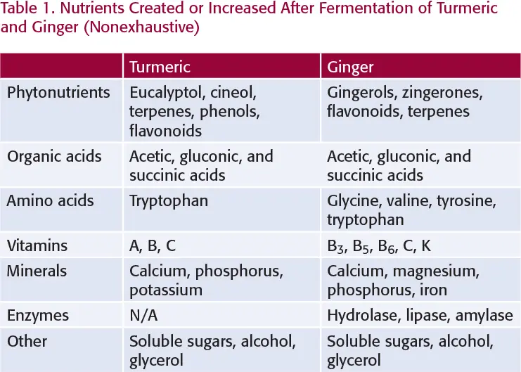 Other recent studies emphasize the enhancing properties of ginger and fermented turmeric; for example, several forms of curcuminoids develop with turmeric, among which the whiter-pigmented tetrahydrocurcumin is far more bioavailable than other curcuminoids. Moreover, an increase in phenols (reports of up to 1:40!), organic acids and other synergistic substances are shown in the following table.