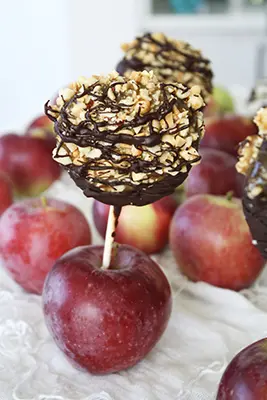 Line a cookie sheet with parchment paper. Slice the apples vertically (I left the core in). Insert sucker sticks into the bottom. Dip the apple slices into the caramel, let excess drip off, and then place flat on the pan. Or place the apples on the pan and spoon the caramel sauce over top.* Place in the freezer for at least 1 hour.