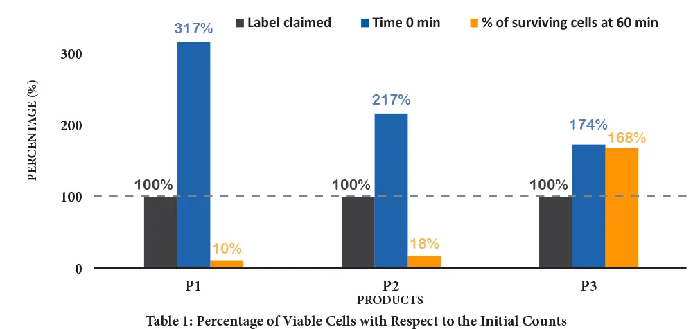 Table 1 shows the percentage of initial viable cell counts and the percentage of cells after 60 minutes of incubation relative to the label claim. Product P3 showed a minimal change in survival rate of 168%, exceeding the label claim. This is attributable to an enteric coating being present on the P3 capsules.