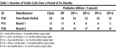To test product viability, the number of colony forming units (CFU) were measured on the date of purchase (DP), 18 months prior to the expiration date. The results revealed that all products evaluated contained viable probiotic bacteria; however, the levels varied considerably. P20 contained more than the claimed culture concentration; 130% of its label claim. The two “shelf-stable” probiotics fell short of their label claim; P15 contained only 77% viable CFU, and P30 contained only 73% viable CFU. Products were subsequently tested at 1, 2, 3, and 6 months following the date of purchase. The results are shown in the table below:
