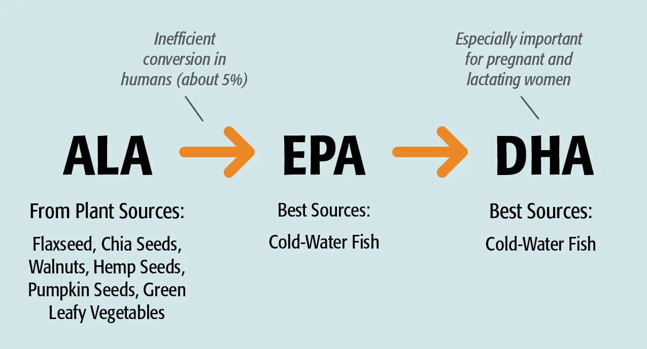 Sources: Fatty fish, flaxseed, chia seeds, walnuts, and some plant oils.