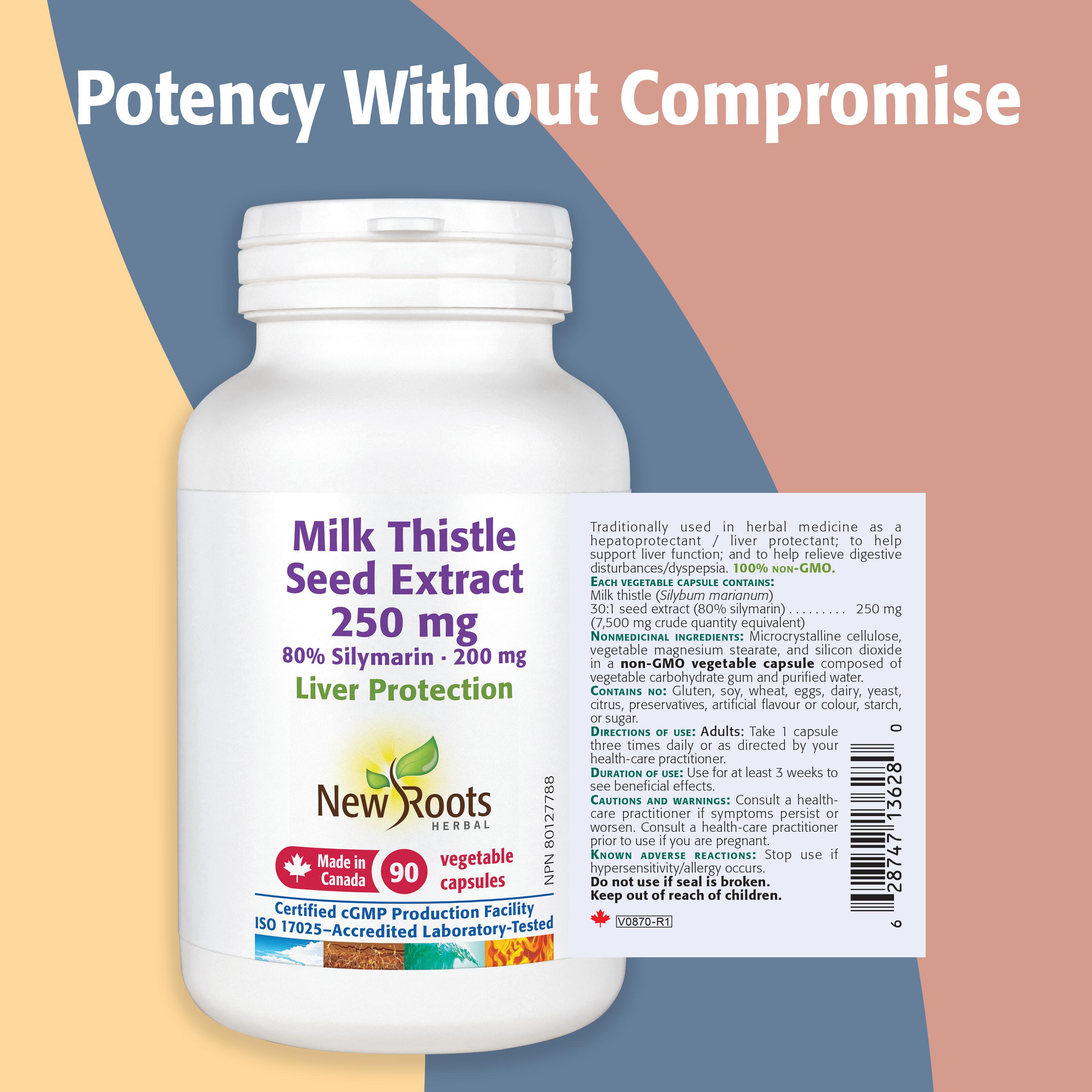 New Roots Herbal’s Milk Thistle Seed Extract offers robust liver protection with a highly concentrated formula. Each non‑GMO vegetable capsule delivers 250 mg of seed extract standardized to 80% silymarin. This potent hepatoprotectant supports liver function and effectively relieves digestive disturbances, providing a certified, laboratory-tested natural solution for your wellness regimen.