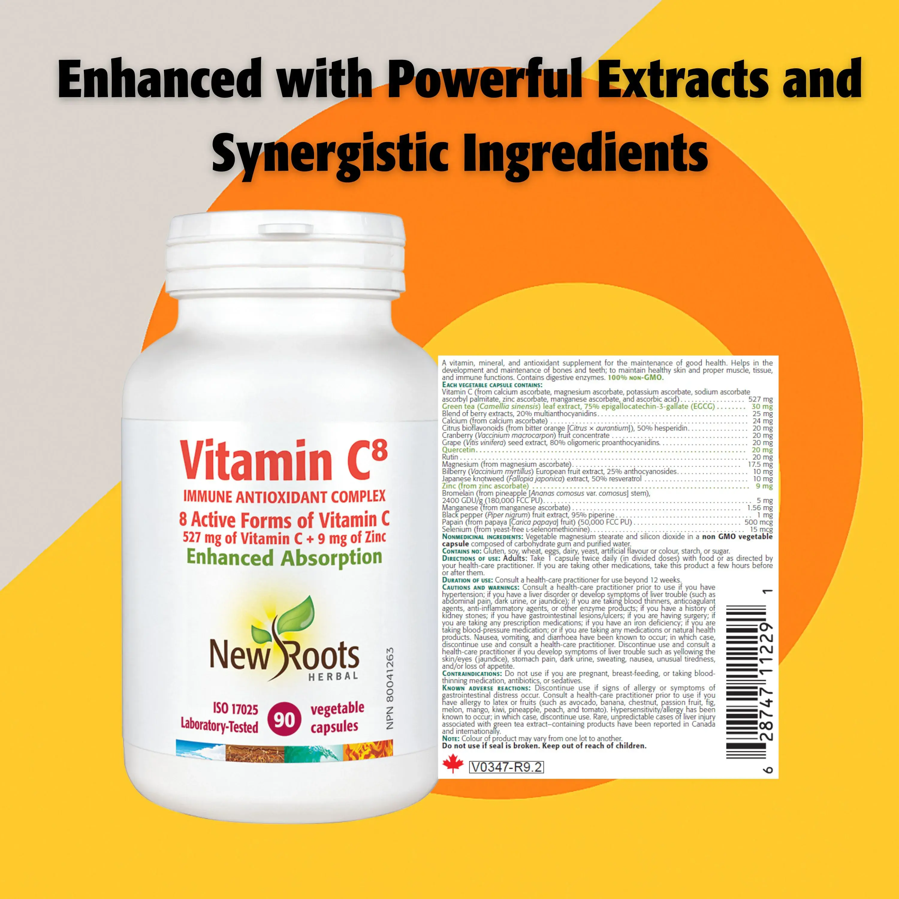8 Active Forms of Vitamin C · 527 mg of Vitamin C + 9 mg of Zinc · Enhanced Absorption
